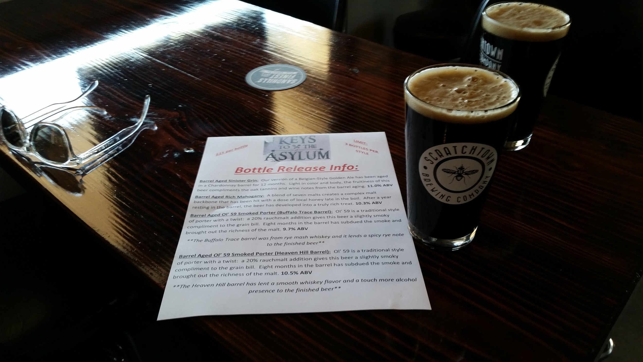 What a day it was to sit outside and enjoy some of the beers of Scratchtown. My favorite of the day was the Vanilla Normal. This breakfast stout has a smooth milky finish with a hint of vanilla and coffee flavor. What a wonderful beer to enjoy on the patio! My friend Jeff, enjoyed the Big Joe Pilsner. He said this was by far the best Pilsner beer he has ever had. We also got some of the Imperial Beers from the "Keys to the Asylum Release" to bring back with us. What a treat to have some of the best imperials in your hands!